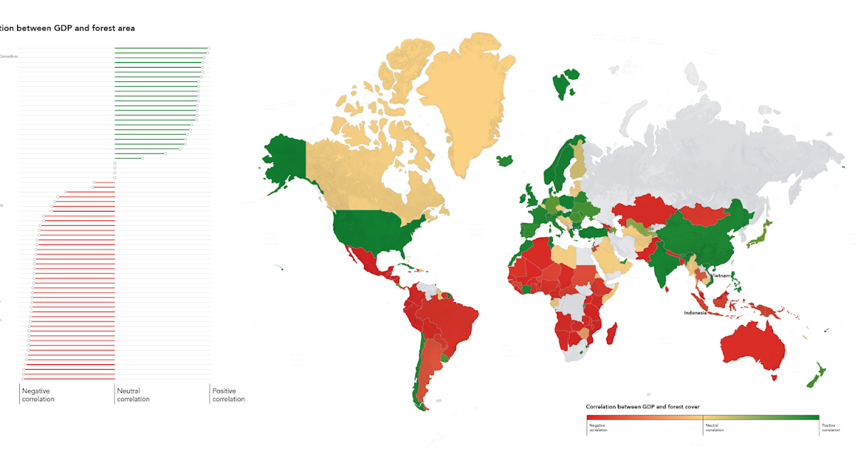 Interesting look at the connection between economic output and deforestation. In many of the richer countries, forests are positively correlated with economic output, in many of the poorer countries, stripping the forests is. There are some wacko outliers, though, like China and India (forests positively correlated). Also Côte d’Ivoire.